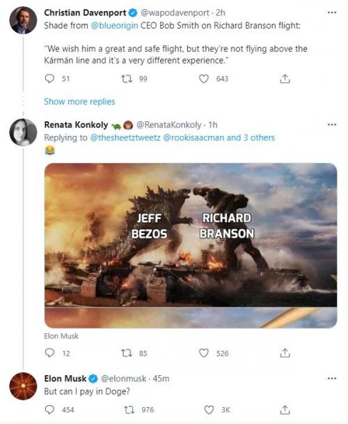 新浪科技讯北京时间7月2日上午消息,马斯克刚刚在Jeff Bezos、Richard Branson太空计划的相关推特下回复:我可以用狗狗币付款吗?