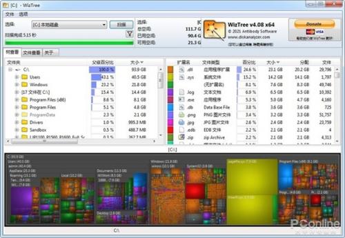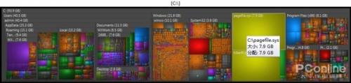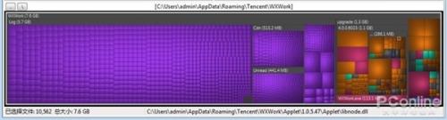 三来,它还可以用图形的方式,来直观地呈现硬盘空间的占用情况——WizTree使用了大小不同的方块来表现硬盘的空间占用情况,体积越大的文件目录,方块也越大。到底哪里产生了占用硬盘空间的大文件,一目了然。