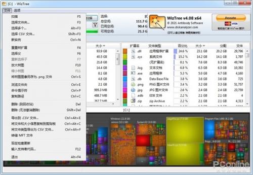 二来,它可以按照扩展名来分类,让你看到哪种文件占体积最多;