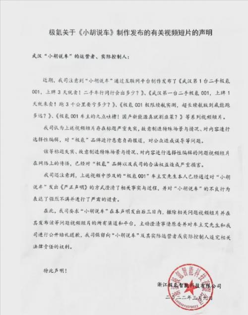 同时,极氪汽车保留向"小胡说车"及其实际运营者或实际控制人追究相关法律责任的权利。