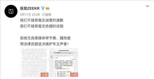 3月11日晚,极氪汽车在微博上表示:“我们不接受毫无诚意的道歉,我们不接受毫无依据的诋毁,拒绝无良黑媒体带节奏、蹭热度,用法律武器坚决维护车主声誉!”