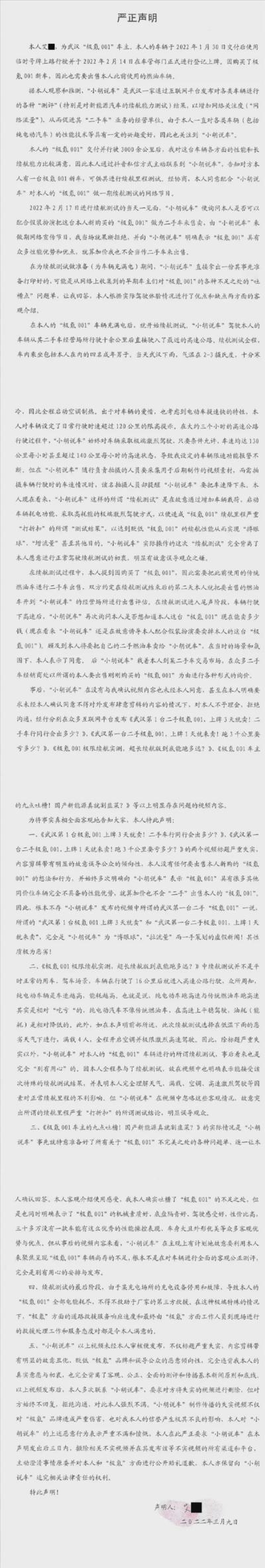 原车主在声明中称,极氪001交付并行驶3000余公里后,对这台车辆各方面的性能和长续航能力比较满意,自行联系“小胡说车”后供其进行续航里程测试。