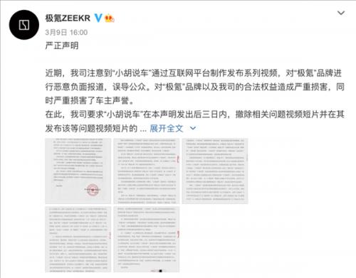 3月9日,极氪汽车突然在微博上发布严正声明。极氪称,留意到近期互联网上出现了一些有关极氪的视频,内容存在恶意负面报道,误导公众。这对“极氪”品牌以及车主声誉造成严重损害,要求对方删除相关的内容并道歉。