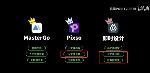 没有比较,还不足以说明性能上的「快」。从B站上的专业设计师孔晨的评测视频中可以看到一些操作的直观对比数据。抖音设计百万粉丝账号“子牧说|且曼学院”也出了评测视频,国内3款设计软件的性能排序是MasterGo性能最优在第一梯队,Pixso和即时设计与MasterGo性能差距明显,属于第二梯队,但是Pixso略胜丢图层的即时设计。