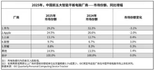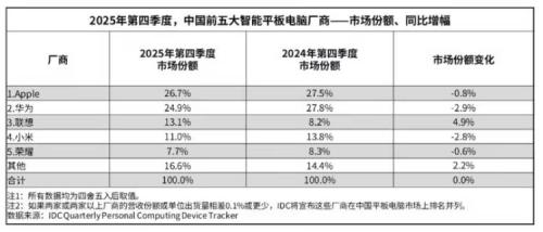 5. IDC:2025年中国平板出货量增13.1%,华为全年领跑,联想逆势增长