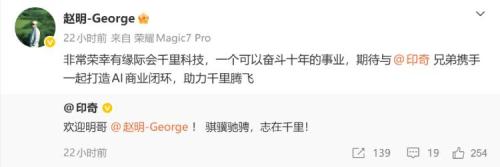 原荣耀CEO赵明昨日宣布加入千里科技,称“非常荣幸有缘际会千里科技,一个可以奋斗十年的事业”,并期待与董事长印奇“携手打造AI商业闭环,助力千里腾飞”。印奇随后发文欢迎:“骐骥驰骋,志在千里!”
