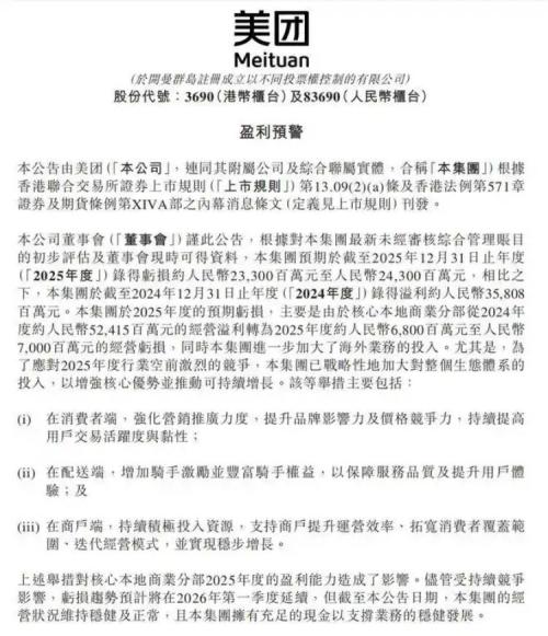 美团发布盈利预警,据初步评估,公司预期截至2025年12月31日止年度录得净亏损约为233亿至243亿元人民币,相较2024年约358.08亿元的溢利,业绩由盈转亏。