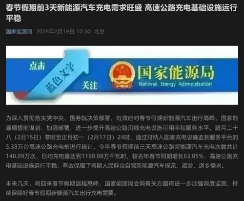 未来几天,将迎来春节假期返程高峰,国家能源局会同有关方面将进一步加强调度监测,持续保障好春节假期新能源汽车出行充电需要。