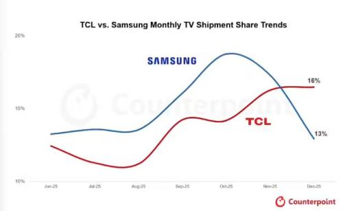 Counterpoint Research数据显示,TCL在2025年12月首次超越三星,登顶全球电视出货量第一。当月TCL出货量同比增长10%,主要得益于亚太、中国及中东非市场的强劲增长,抵消了北美和西欧的下滑。