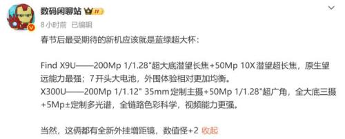 博主“数码闲聊站”今日发文称,春节后最值得期待的新机当属OPPO Find X9 Ultra和vivo X300 Ultra两款“超大杯”,并披露了其核心规格。