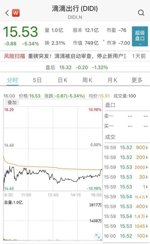 受到网络安全审查消息影响,昨夜滴滴股价大跌,盘中一度跌超10%,随后跌幅有所收窄,最终收盘跌跌5.34%,报15.53美元/股,总市值749亿美元(约合人民币4848亿),相较上一交易日市值蒸发超200亿人民币。