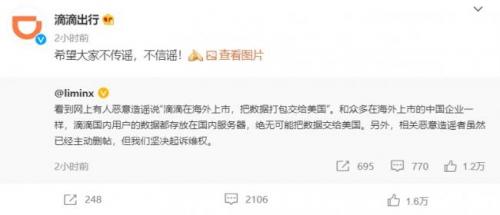 近日有传言称滴滴为赴美上市把中国道路信息和用户数据泄露给美国。7月3日午间,滴滴出行副总裁在微博发文称:“看到网上有人恶意造谣说“滴滴在海外上市,把数据打包交给美国”。和众多在海外上市的中国企业一样,滴滴国内用户的数据都存放在国内服务器,绝无可能把数据交给美国。另外,相关恶意造谣者虽然已经主动删帖,但我们坚决起诉维权。”