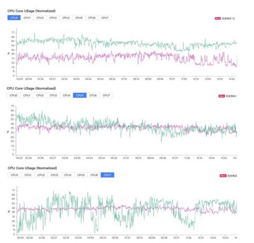 为了探索两款芯片背后的调度策略,通过Perfdog中的CPU Core Usage测试了两款手机运行游戏时CPU的利用情况。测试数据显示,相同的测试环境下,新骁龙8的CPU X2超大核在运行游戏时,频率稳定在800MHz左右,但会在需要的时候上升至2.7甚至2.8GHz,更高的频率,也代表需要更多的能耗以及产生更高的发热量;而天玑9000的X2超大核会全程参与运算,持续稳定在1.8GHz,减轻了其他核心的负担。