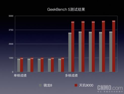 首先,使用GeekBench 5测试了两款产品的CPU性能。最终成绩显示,天玑9000单核跑分略胜新骁龙8,多核跑分相比新骁龙8拥有明显的优势。与此同时,Redmi K50 Pro在Geek Bench跑分下的平均功耗为5.6W,新骁龙8终端平均功耗为6.4W,Redmi K50 Pro领先了将近12%,可见Redmi K50 Pro搭载天玑9000不仅在性能上胜于新骁龙8终端,能效表现更加优秀。通过分析得出,Redmi K50 Pro亮眼的能效优势,得益于联发科自研的“全局能效优化技术”。