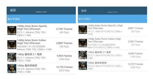 接着,在GFXBench中对两款手机的GPU性能进行了曼哈顿3.0(1080p)、曼哈顿3.1(1080p)阿兹特克废墟Vulkan Normal(1440p)、阿兹特克废墟OpenGL Normal(1440p)等多个项目的离屏测试。最终结果显示,无论是1080p还是2K,天玑9000和新骁龙8的GPU性能相差不大。