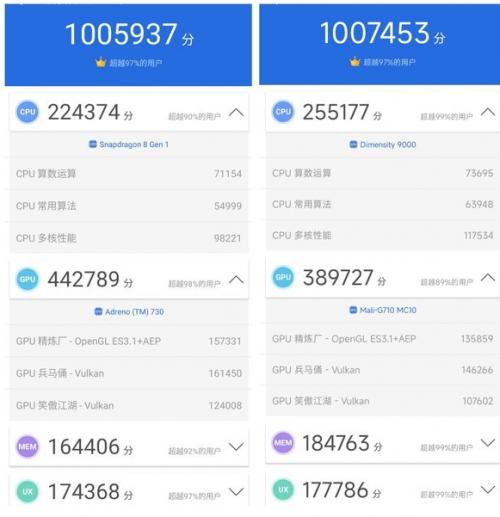 随后,在对两款手机的安兔兔跑分测试中,室温环境下,Redmi K50 Pro综合得分略高于新骁龙8终端,CPU得分优势明显,在GPU得分项上,天玑9000要稍低于新骁龙8。从跑分成绩看,新骁龙8所搭载的新一代Adreno 730 GPU要强于天玑9000的Mali-G710,但并不代表Redmi K50 Pro的GPU图形处理能力不及新骁龙8终端,接下来需要通过游戏实测来证明两款手机究竟谁胜谁负。