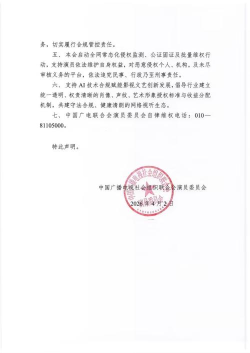 五、本会启动全网常态化侵权监测、公证固证及批量维权行动,支持演员依法维护自身权益,对恶意侵权个人、机构,及未尽审核义务的平台,依法追究民事、行政乃至刑事责任。