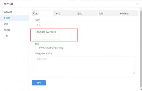 Project中的Kanban支持通过限制每一个阶段允许积压的在制品数量来避免大量工作并行,达到控制混乱的目的(这一行为被称为在制品限制(WIP limit)。