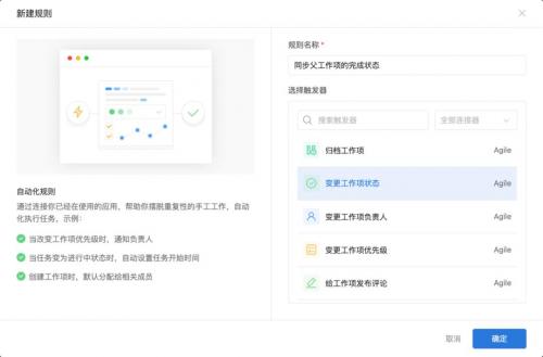 能够帮助团队将开发中大量低价值、重复性的和事务性的工作从手动操作变为自动触发执行,比如自动变更工作项状态、自动变更负责人等等,让团队专注于真正有价值的任务。