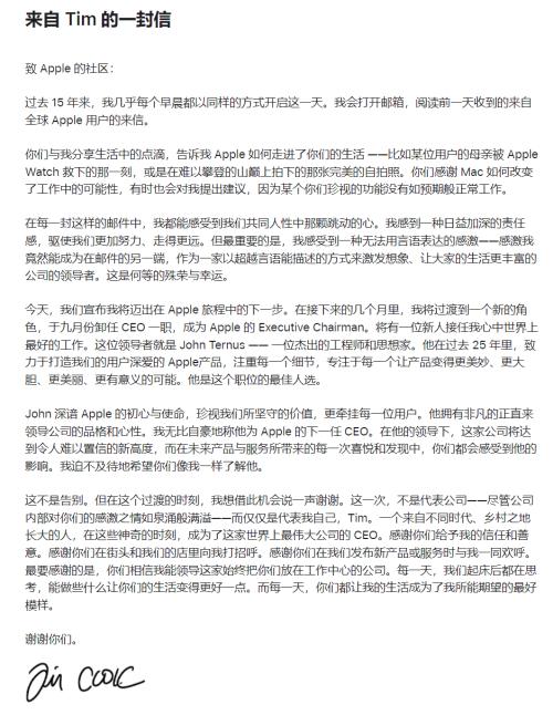 卸任CEO后,库克将继续负责政策、隐私与环保相关事务。