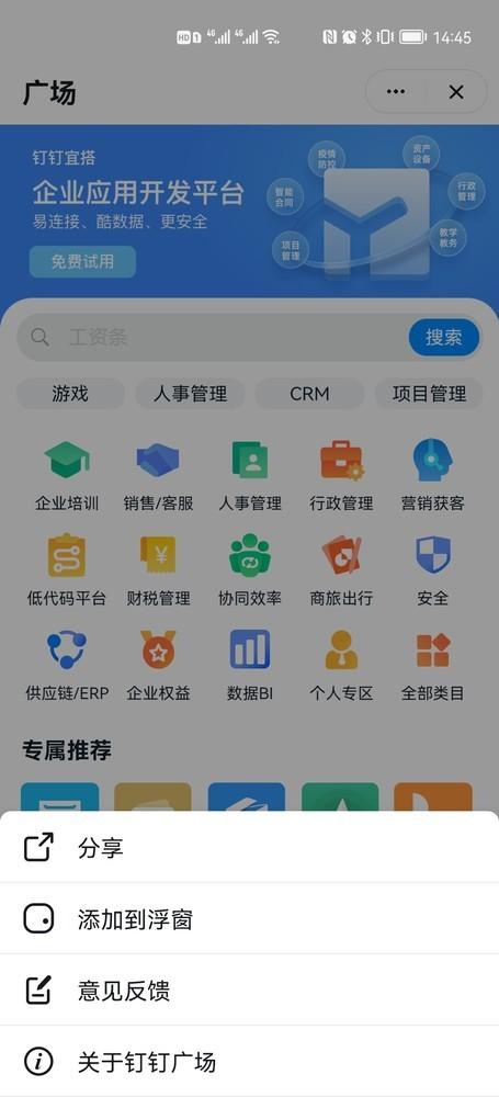 “浮窗”功能的打开也很简单,只要在钉钉应用中心、小程序等界面中,点击右上角“...”就可以打开,并支持添加多个浮窗,对经常用手机处理工作的人来说比较友好。