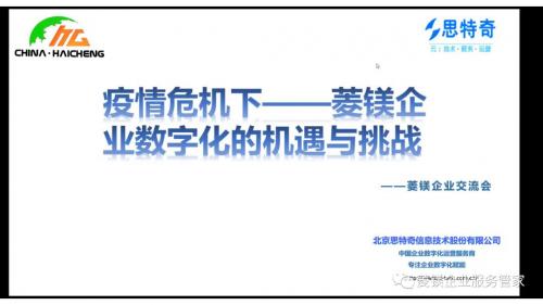 本次会议是疫情期间菱镁产业发展服务中心首次举办的在线交流会,为今后持续的线上政企沟通交流打下良好基础。未来,思特奇将依托自身在企业智能化领域领先优势,持续加强与菱镁中心的密切合作,双方合力打造菱镁产业良好生态,共同为菱镁企业转型发展赋能。