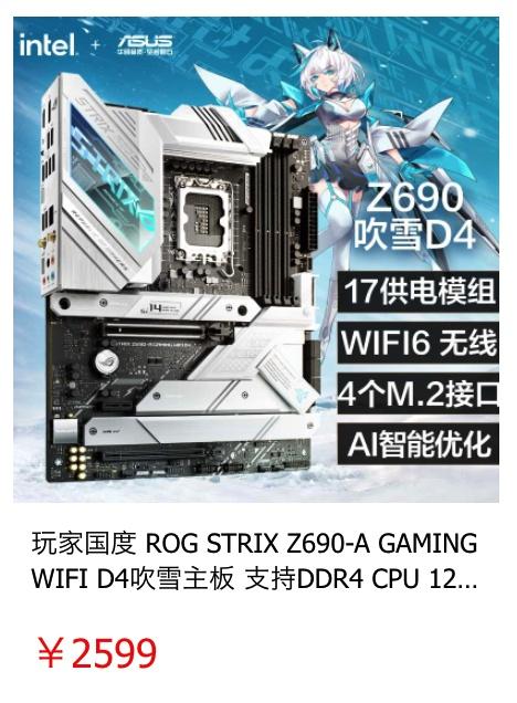 想要打造高颜值12代英特尔酷睿处理器主机的玩家,一定不要错过华硕Z690吹雪D4主板(ROG STRIX Z690-A GAMING WIFI D4)。该主板作为吹雪家族最新成员,将全新ROG设计元素与赛博朋克风相融合,令其未来科技感十足。同时,主板芯片组散热装甲上加入蓝白配色的潮流ROG理线带的设计,丰富了主板上的设计元素,而且十分实用。超大的I/O盔甲经过巧妙设计,利用特殊双层材质,配合RGB灯效可呈现更具层次感的立体效果,颜值爆表!现该主板京东售价2599元,可享6期免息福利。购买链接:https://item.jd.com/100027860514.html