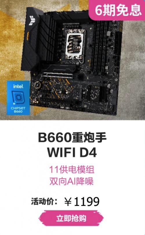 华硕B660重炮手WIFI D4主板(TUF GAMING B660M-PLUS WIFI D4)全新升级,其延续了电竞特工系列一贯的军规用料和稳定耐用,并拥有重炮手家族强大的电竞基因,凭借硬实力备受玩家好评。该主板采用M-ATX板型,经典黄黑配色,同时主板侧边的AURA RGB边缘灯效更换成了更具识别度的“TUF”字样,尽显硬派风范。现该主板京东粉丝价仅需1069元,还可享6期免息福利,入手良机不可错过!购买链接:https://item.jd.com/100031223640.html