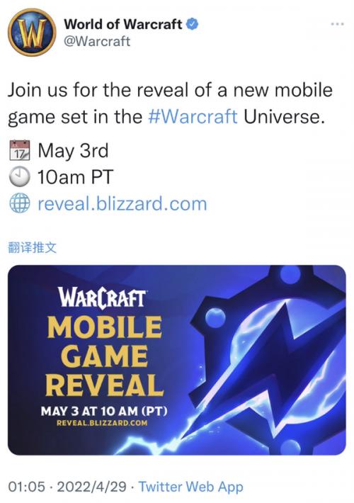 4月29日,知名游戏开发商动视暴雪宣布将于当地时间下周二(5月3日)上午10点揭晓魔兽争霸手游,对应的是北京时间5月4日凌晨1点。