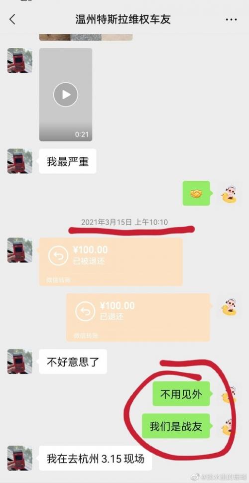 她同时表示,2021年3月10日陈俊意主动添加她的微信,自称是特斯拉温州失控车主,事故情况最严重。他主动提供了电话并给她发了100元红包,希望张女士给予维权上的协助。张女士拒绝了红包,并安慰了他,称大家都是受害者不必客气。