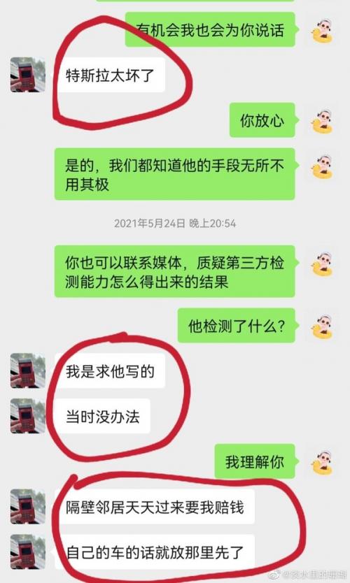 此外,另一名在道歉书中被提及的维权车主韩先生也发文表示,在道歉信发布后,陈俊意便将其拉黑。在他看来,陈俊意与特斯拉之间的名誉权纠纷和他并没关系,不应该把他牵扯进来。他同时也放出了自己和陈俊意的聊天记录。在聊天记录中陈俊意表示,道歉信是特斯拉写的。韩先生在微博最后表示自己将不会妥协,继续维权。
