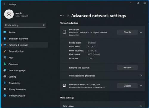 正如上方图片所示,用户能够在“网络适配器”条目下启用/禁用网络连接。这项功能此前只能通过控制面板进行访问。而在不久的将来,Windows 11将尽可能引导用户到设置应用中。
