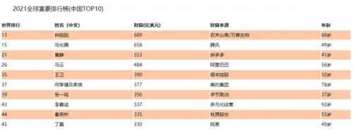 其中上榜的中国前十位富豪分别是钟(农户山泉/万泰生物)、马化腾(腾讯)、黄峥(拼多多)、马云(阿里巴巴)、王卫(顺丰控股)、何亨健及家族(美的集团)、张一鸣(字节跳动)、李嘉诚(多元化经营)、秦英林(牧原股份)以及丁磊(网易)。