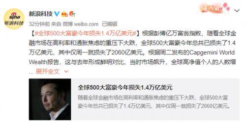 在全球经济下行的大背景下,不仅普通小老百姓的日子不好过,富豪们的财富也缩水了。根据彭博亿万富翁指数,随着全球金融市场在高利率和通胀焦虑的重压下大跌,全球500大富豪今年总共已损失了1.4万亿美元,其中仅周一就损失了2060亿美元。