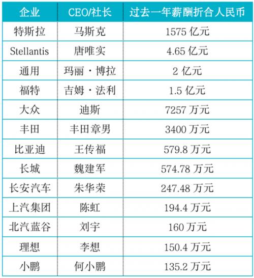 2021年部分车企CEO年薪表(图源第一财经)