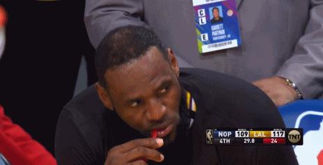 NBA巨星詹姆斯在场边吃Twizzler糖果