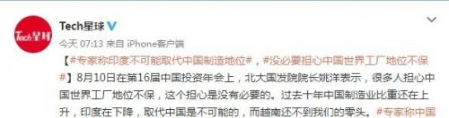 8月10日,在第十六届中国投资年会上,北大国发院院长姚洋认为,没必要担心中国世界工厂地位不保。他说,过去十年中国制造业比重不降反升,印度则在下降,取代中国是不可能的。而越南的制造业还不到中国制造业的零头,取代中国制造也不太可能。