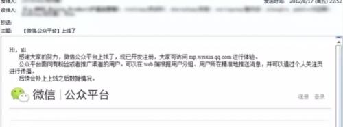 据CNMO了解,8月17日,微信官方公众号“微信派”发文称,今日是微信公众平台上线10周年纪念日。微信派还公布了一张内部邮件截图,邮件显示2012年8月17日晚微信公众平台正式上线。从邮件内容可知,微信公众号建立之初旨在面向有粉丝或者推广渠道的用户,在web端根据用户分组、用户所在精准推送消息,并通过个人关注页进行传播。