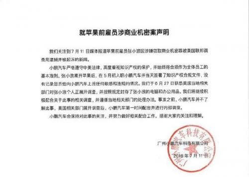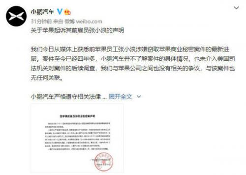 8月23日,小鹏汽车正式发布“关于苹果起诉其前雇员张小浪的声明”。