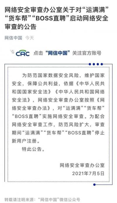 2021年7月5日上午,网信办发布《网络安全审查办公室发布关于对“运满满”“货车帮”“BOSS直聘”启动网络安全审查的公告》(下称《公告》),《公告》显示为防范国家数据安全风险,维护国家安全,保障公共利益,依据《中华人民共和国国家安全法》《中华人民共和国网络安全法》,网络安全审查办公室按照《网络安全审查办法》,对“运满满”“货车帮”“BOSS直聘”实施网络安全审查。为配合网络安全审查工作,防范风险扩大,审查期间“运满满”“货车帮”“BOSS直聘”停止新用户注册。