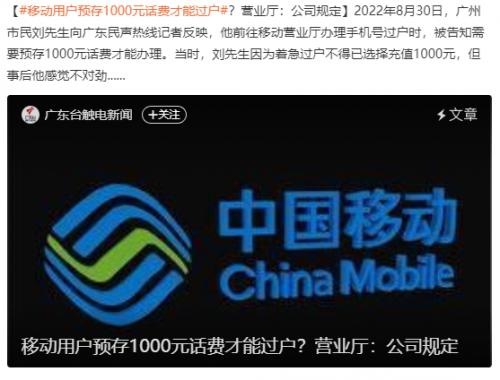 只要提到通信运营商,我们一般想到的就是“三大运营商”:中国移动、中国联通以及中国电信。近日,CNMO了解到,有用户反映,他前往移动营业厅办理手机号过户时,被工作人员告知需要预存1000元话费才能办理。究竟怎么回事呢?