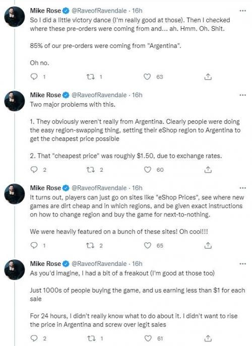 对于经常在Switch或Steam上购买游戏的玩家来说,可能并不会对“阿根廷人”这个梗感到陌生,由于不少平台都可以选择玩家所在的地区并且根据所在地货币购买游戏,因此目前正经历严重通货膨胀的阿根廷成为了不少玩家选择“薅羊毛”的地区。近日,独立游戏发行商No More Robots负责人Mike Rose(麦克罗斯)在旗下新游戏《Let's Build a Zoo》发售之际,发推谈论玩家跨区购买游戏问题,并且就许多玩家前往阿根廷区购买游戏这一现象发表了自己的看法。