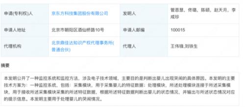 企查查APP显示,京东方申请的“监控系统和监控方法”专利获授权。企查查专利摘要显示,该发明涉及电子技术领域,主要目的是判断出婴儿出现哭闹的具体原因。主要技术方案为:一种监控系统,包括:采集模块,用于采集婴儿的特征数据;处理模块,连接于采集模块,用于接收述采集模块采集的特征数据,根据特征数据判断出婴儿的状态情况,并输出与所述状态情况对应的提示信息。