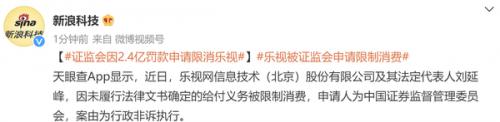 天眼查App显示,近日,乐视网信息技术(北京)股份有限公司及其法定代表人刘延峰,因未履行法律文书确定的给付义务被限制消费,申请人为中国证券监督管理委员会,案由为行政非诉执行。