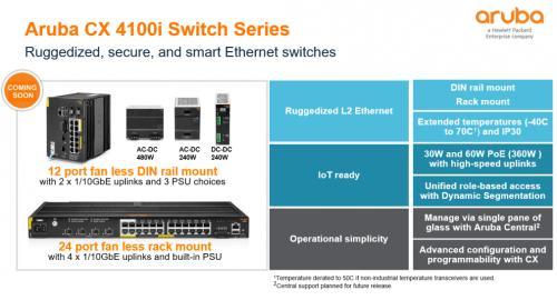 ?Aruba CX 4100i,一系列坚固耐用的交换机,可以抵御极端温度和恶劣环境,非常适合需要始终在线的PoE和高性能有线连接的工业物联网应用