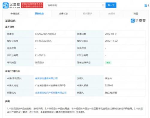 根据企查查App显示的信息,11月22日,维沃移动通信有限公司外观专利“游戏手柄”获得了授权。专利摘要显示,本外观设计产品为一款匹配手机进行游戏操作的游戏手柄使用,设计要点在于形状。从相关图片我们可以看到,这款游戏手柄只有一边,能够卡住手机。同时,其正面设有一个摇杆、一个十字键和一个比较特殊的药丸形状按键,手柄的正上方还有扳机和肩键。