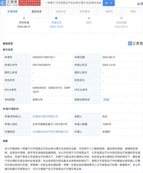 相关信息显示,中国银行申请的“一种基于元宇宙营业厅的业务办理方法及相关设备”专利公布。这项专利并不复杂,总结来看就是:通过构建元宇宙营业厅,可以方便客户在元宇宙营业厅办理交易业务。