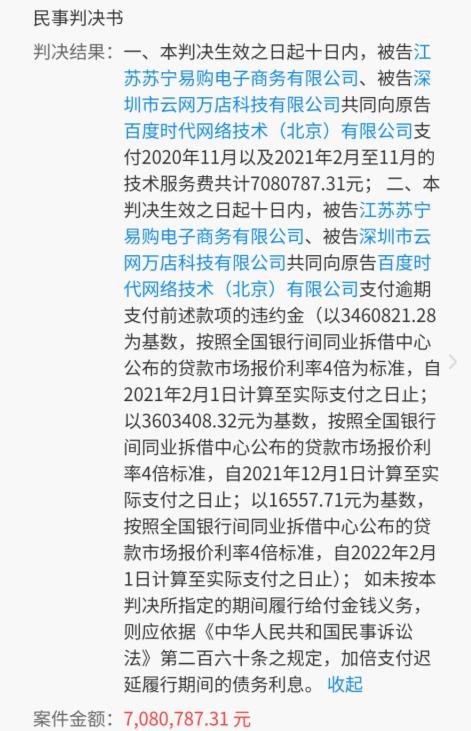 苏宁易购是国内领先的电商平台,然而这家公司目前似乎已经陷入了困境,以至于连广告费都难以支付。近日,CNMO注意到,百度时代网络技术(北京)有限公司与江苏苏宁易购电子商务有限公司、深圳市云网万店科技有限公司技术服务合同纠纷一审法律文书公开。