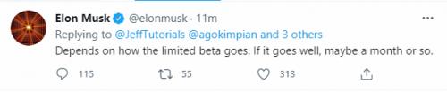 新浪科技讯北京时间7月8日下午消息,特斯拉CEO埃隆・马斯克今日发推特,大意是如果全自动驾驶(FSD)有限测试版进展顺利,“可能需要一个月左右的时间”才能向公众推出。