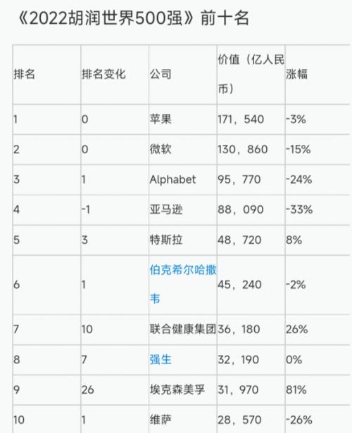 目前,这份榜单中排名前十的企业分别为苹果、微软、谷歌母公司Alphabet、亚马逊、特斯拉、伯克希尔哈撒韦、联合健康集团、埃克森美孚、维萨。其中,苹果的市值最高,高居17万亿元人民币以上,而微软的市值也高居13万亿之上,排名第十的维萨则在2.8万亿左右。